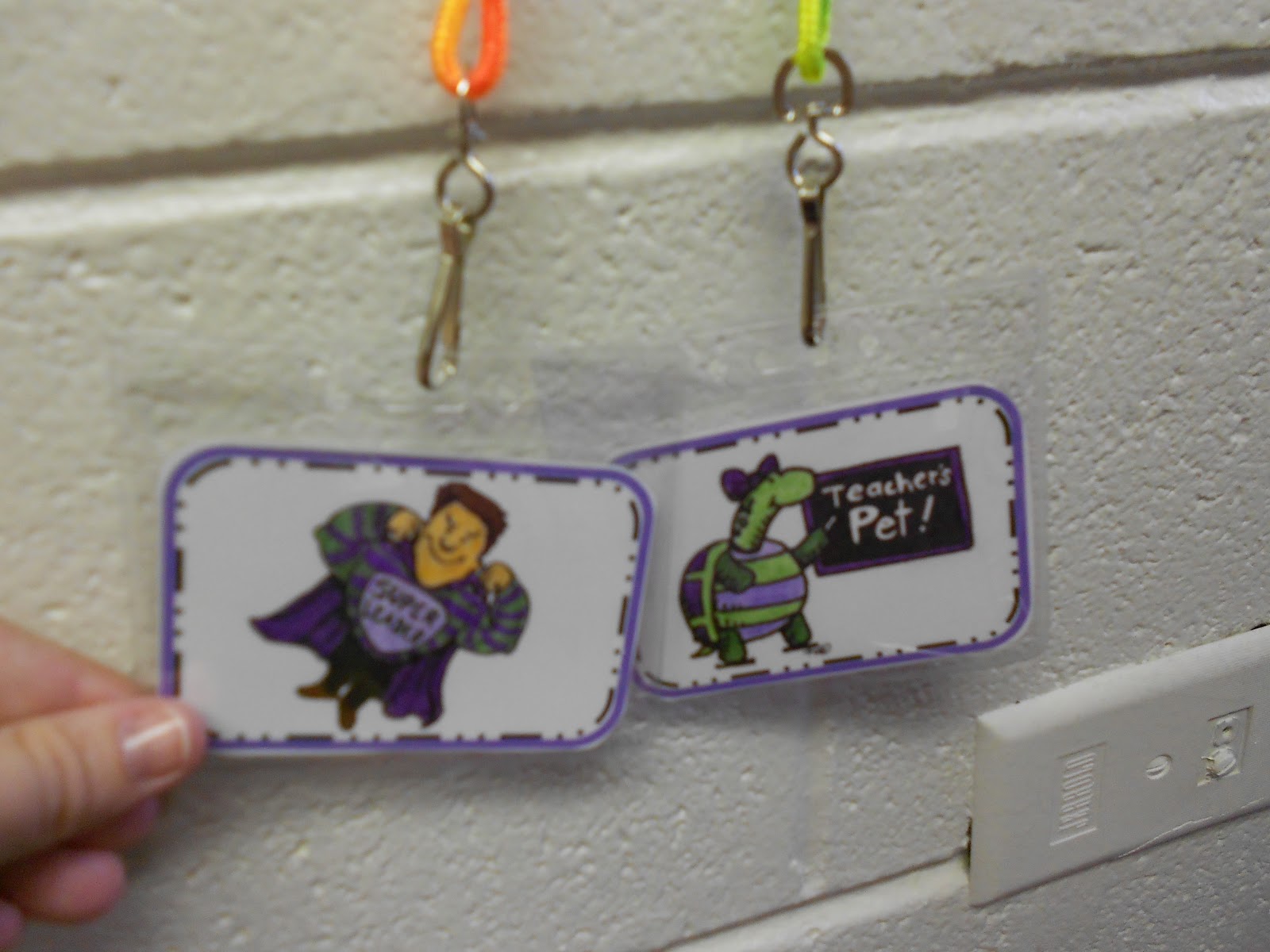 In staying with my purple theme, I also found these cool paws. I tried a lot of jobs last year which was way too much trouble, so at the end of the year- I finally came up with two jobs that my students really loved. I have a Super Line-Up Leader who is in charge of leading the line and picking the line-up song. I also have a Teacher's Pet who holds the door, passes out soap at lunch, takes the lunch count, and is actually the Teacher's Pet all day long. They get to do everything! I just have the boys' names on one ring, and the girls' names on the other. I switch them once everyone has had a turn. It is so EASY! This year, I also added the necklaces that are shown below. They love wearing their own tags each day, and honestly, they are even keeping them really clean. They hang them back on the wall before going outside. They are very responsible with them!